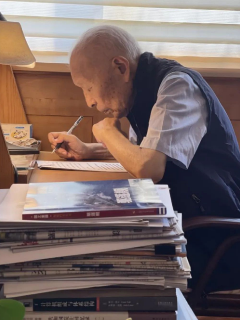 我是记者江晓晨。92岁的潘镜芙左眼几乎失去了感光能力,他把工作台放在阳台,这里采光好,方便他读书写字。下午的阳光透过玻璃,打在书本上。潘镜芙向前探着身,平静而专注,大约他还想离书本更近一些,看得再仔细一些,这样才能赶上不断移行的阳光,赶上嘀嗒疾走的时间。